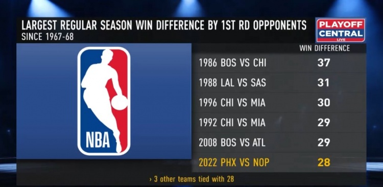 据统计,本赛季常规赛,太阳(64胜18负)与鹈鹕(36胜46负)之间的胜场差为28,这是季后赛历史首轮对阵中并列第5大(还有3支其他球队做到过)的胜场差。