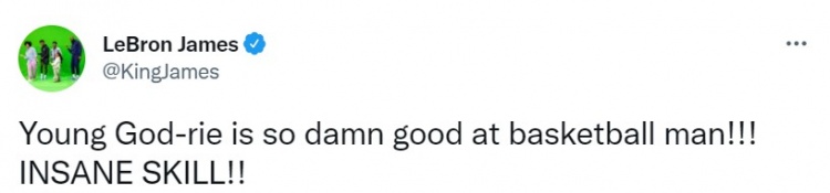 詹姆斯更推大赞欧文,詹姆斯写道:“年轻的‘上帝文’篮球打得也太棒了!不可思议的技巧!”