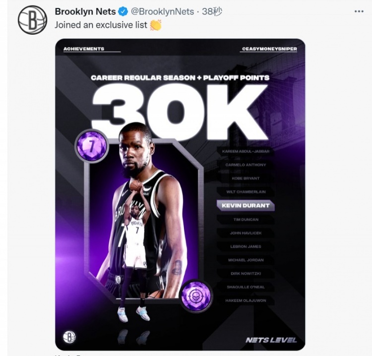 4月18日讯 今日NBA季后赛首轮G1,篮网客场挑战凯尔特人。 比赛进行到末节,杜兰特21投8中得到21分,职业生涯季后赛得分来到4475,职业生涯季后赛与常规赛总得分突破30000分大关(常规赛总得分25526)。 他也成为NBA历史上第13位达成此成就的球员,现役仅次于詹姆斯(44693,排名历史第一)和安东尼(30203,排名第11位)。下图为本场比赛之前数据。