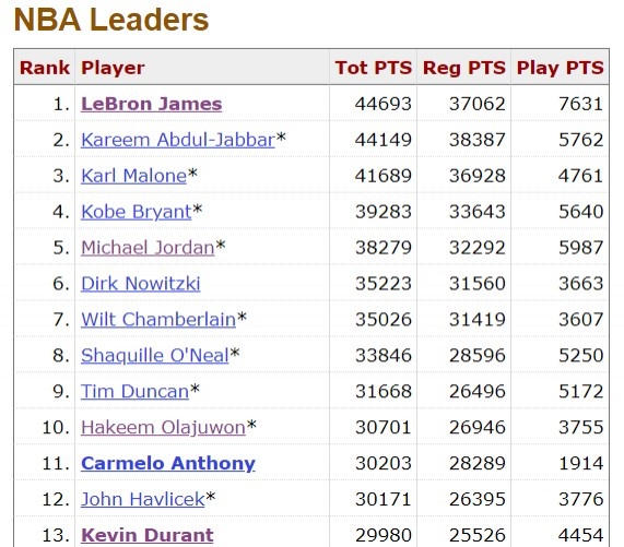 他也成为NBA历史上第13位达成此成就的球员,现役仅次于詹姆斯(44693,排名历史第一)和安东尼(30203,排名第11位)。下图为本场比赛之前数据。