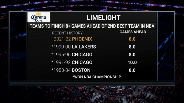 比赛过程中,转播方打出数据显示太阳本赛季常规赛比联盟第二的灰熊多赢8场(太阳64胜,灰熊56胜)。NBA历史上此前出现过四次联盟头名球队比第二名多赢至少8场的情况,而这四支常规赛冠军都最终夺冠,具体如下: