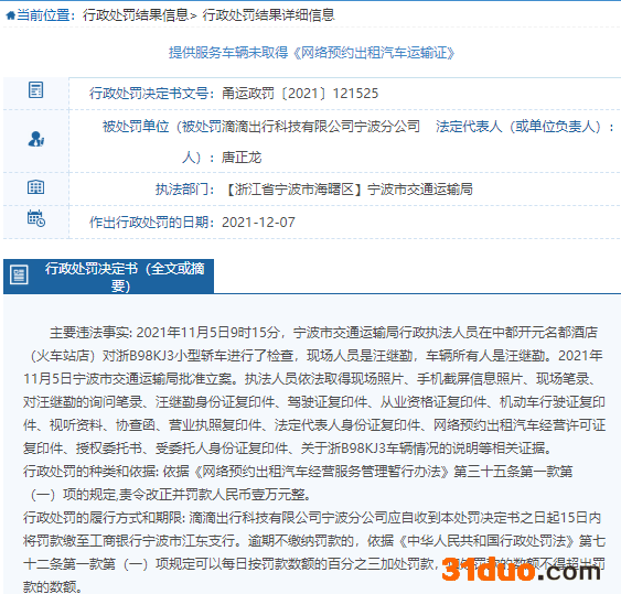 行政处罚决定书(甬运政罚〔2021〕121525)显示,主要违法事实为,2021年11月5日9时15分,宁波市交通运输局行政执法人员在中都开元名都酒店(火车站店)对浙B98KJ3小型轿车进行了检查,现场人员是汪继勤,车辆所有人是汪继勤。2021年11月5日宁波市交通运输局批准立案。依据《网络预约出租汽车经营服务管理暂行办法》第三十五条第一款第(一)项的规定,宁波市交通运输局责令滴滴出行科技有限公司宁波分公司改正并罚款人民币壹万元整(1万元)。