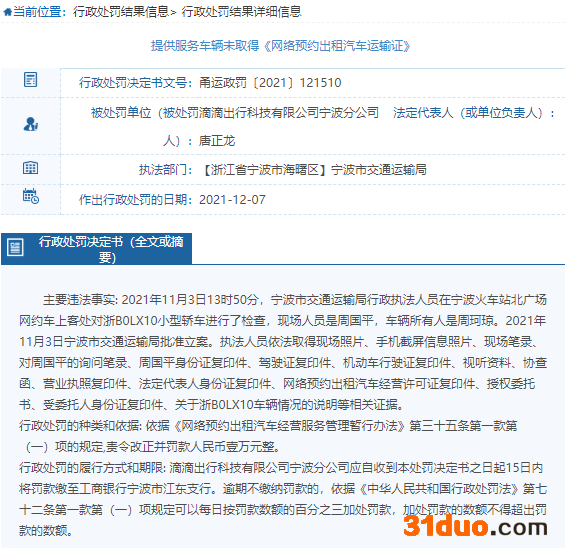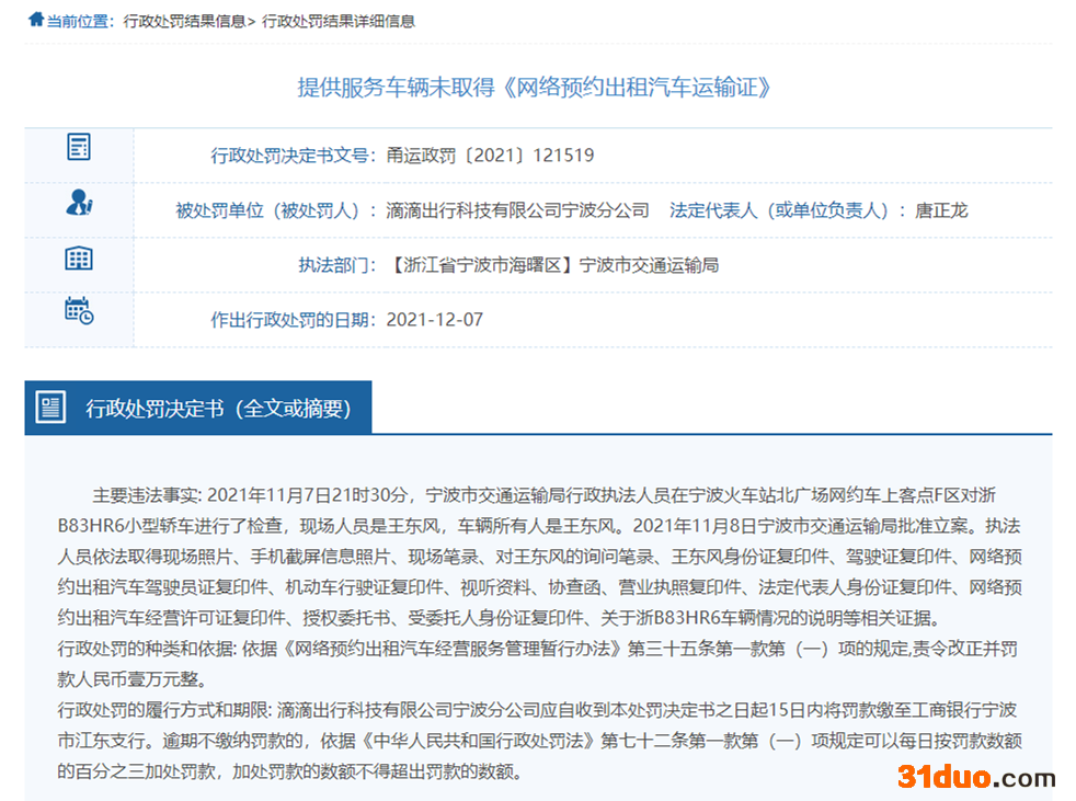 行政处罚决定书(甬运政罚〔2021〕121519)显示,主要违法事实为,2021年11月7日21时30分,宁波市交通运输局行政执法人员在宁波火车站北广场网约车上客点F区对浙B83HR6小型轿车进行了检查,现场人员是王东风,车辆所有人是王东风。2021年11月8日宁波市交通运输局批准立案。依据《网络预约出租汽车经营服务管理暂行办法》第三十五条第一款第(一)项的规定,宁波市交通运输局责令滴滴出行科技有限公司宁波分公司改正并罚款人民币壹万元整(1万元)。