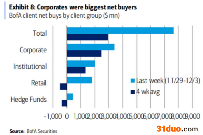 美国银行研究团队根据自营客户交易活动总结称,上周美国上市公司买了34亿美元自己公司的股票,交易额较前一周翻倍,这也是该统计口径下今年三月以来的最高值。美银同时表示,虽然高净值个人投资者和机构投资者都在抄底,但在该行的客户中,来自上市公司回购的交易量占到所有买单的近一半。