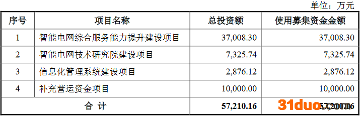 泽宇智能本次发行募集资金总额为14.52亿元,扣除发行费用后募集资金净额为13.32亿元。泽宇智能最终募集资金净额比原计划多7.60亿元。泽宇智能于12月3日披露的招股说明书显示,公司拟募集资金5.72亿元,拟分别用于智能电网综合服务能力提升建设项目、智能电网技术研究院建设项目、信息化管理系统建设项目和补充营运资金项目。