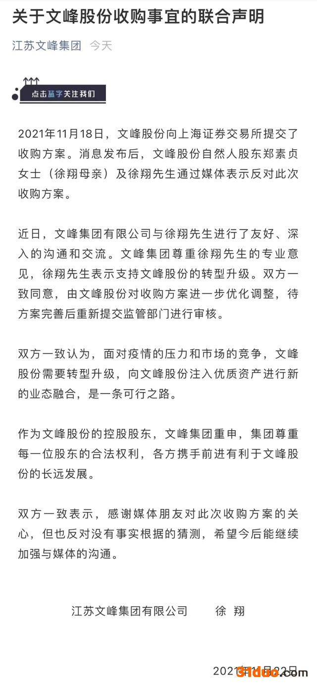 11月22日午后,文峰股份控股股东江苏文峰集团与徐翔发布《关于文峰股份收购事宜的联合声明》称,近日,文峰集团有限公司与徐翔先生进行了友好、深入的沟通和交流。文峰集团尊重徐翔先生的专业意见,徐翔先生表示支持文峰股份的转型升级,“双方一致同意,由文峰股份对收购方案进一步优化调整,待方案完善后重新提交监管部门进行审核。”联合声明表示,双方一致认为,面对疫情的压力和市场的竞争,文峰股份需要转型升级,向文峰股份注入优质资产进行新的业态融合,是一条可行之路。