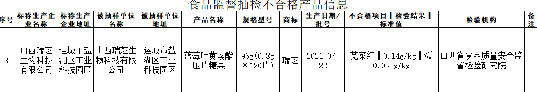 本次抽检发现,标称山西瑞芝生物科技有限公司生产的于2021年7月22日生产的蓝莓叶黄素酯压片糖果(规格:96g(0.8g×120片))苋菜红不合格,检验结果为0.14g/kg。标准值为≤0.05 g/kg,检验机构为山西省食品质量安全监督检验研究院。