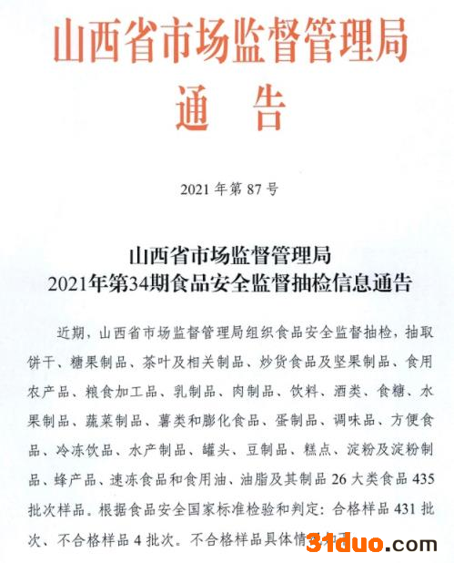 中国经济网北京12月8日讯 山西省市场监督管理局(知识产权局)网站近日公布的《2021年第34期食品安全监督抽检信息通告》显示,近期,山西省市场监督管理局组织食品安全监督抽检,抽取饼干、糖果制品、茶叶及相关制品、炒货食品及坚果制品、食用农产品等26大类食品435批次样品。根据食品安全国家标准检验和判定:合格样品431批次、不合格样品4批次。