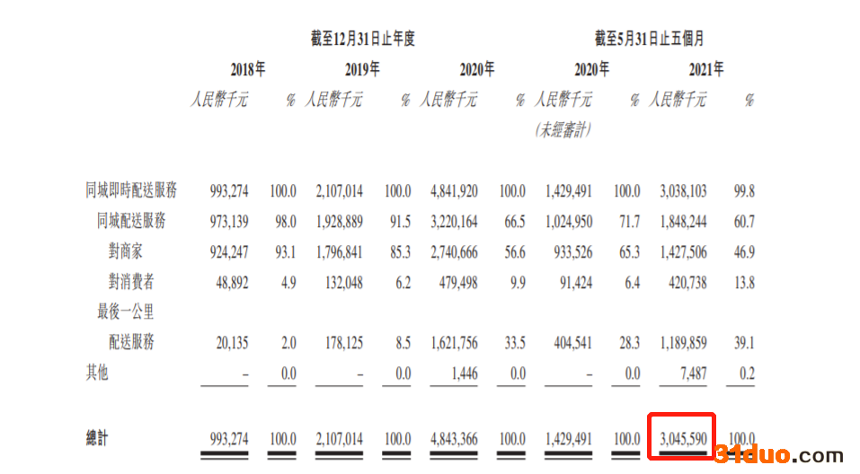 杭州顺丰同城实业来自五大客户的收入分别占同期总收入的67.8%、67.1%、61.2%及61.1%。于2018年、2019年、2020年各年及截至2021年5月31日止五个月,来自最大客户的收入分别占同期总收入的22.7%、19.4%、33.6%及38.6%。于2018年、2019年、2020年各年及截至2021年5月31日止五个月,来自顺丰控股集团的收入分别占同期总收入的2.9%、13.1%、33.6%及38.6%。