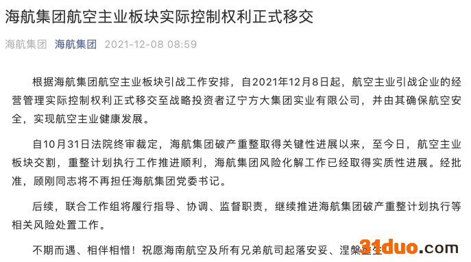中华网财经讯,12月8日,据海航集团消息,根据海航集团航空主业板块引战工作安排,自2021年12月8日起,航空主业引战企业的经营管理实际控制权利正式移交至战略投资者辽宁方大集团实业有限公司,并由其确保航空安全,实现航空主业健康发展。