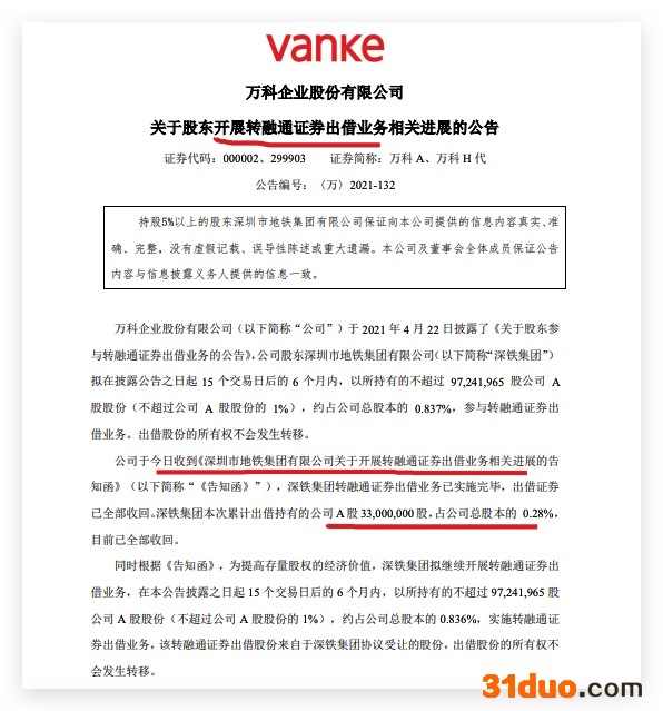 公告中万科称,在12月7日收到《深圳市地铁集团有限公司关于开展转融通证券出借业务相关进展的告知函》,深铁集团转融通证券出借业务已实施完毕,出借证券已全部收回。深铁集团本次累计出借持有的万科A股3300股,占公司总股本的0.28%,目前已全部收回。