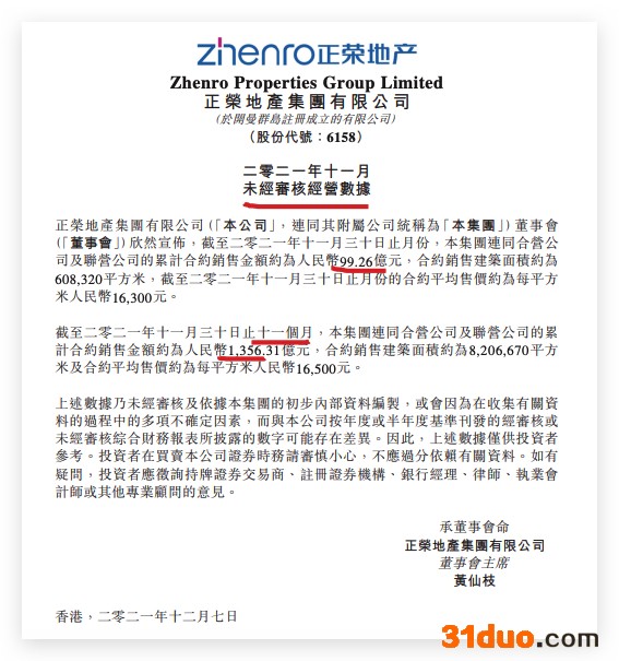 11月单月,正荣地产连同合营公司及联营公司的累计合约销售金额约为人民币99.26亿元,较上月环比微增1.3%,同比下降约34%,合约销售建筑面积约为608,320平方米,截至2021年11月30日止月份的合约平均售价约为每平方米人民币16,300元。
