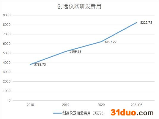 从研发创新方面看,创远仪器穆迪·BVD企业创新指数65.09,创远仪器2021三季报研发费用为8222.75万元,研发占比达29.37%。且创远仪器研发费用连年增长,2018年至2020年分别为3789.73万元、5169.28万元、6197.22万元。