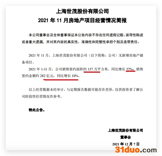 新增项目方面,公告显示,2021年11月,上海世茂股份有限公司无新增房地产储备项目。