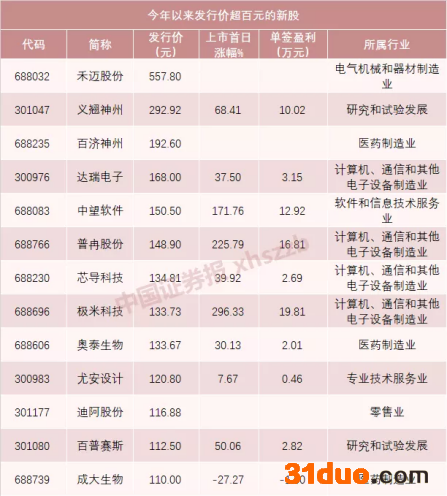 Wind数据显示,今年以来,A股发行价超过百元的新股已有13只。10只已上市新股中,有4只单签盈利超过10万元,只有10月末上市的成大生物在上市首日破发。