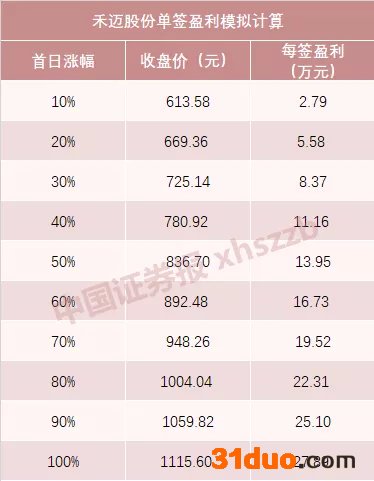 中一签禾迈股份(500股)需缴款27.89万元,若上市首日涨幅能达到20%,中一签便可赚超5万元;若涨幅能达到36%,则可实现中一签赚10万元;若涨幅能达到80%,则其股价将超过1000元,中一签可赚超22万元。