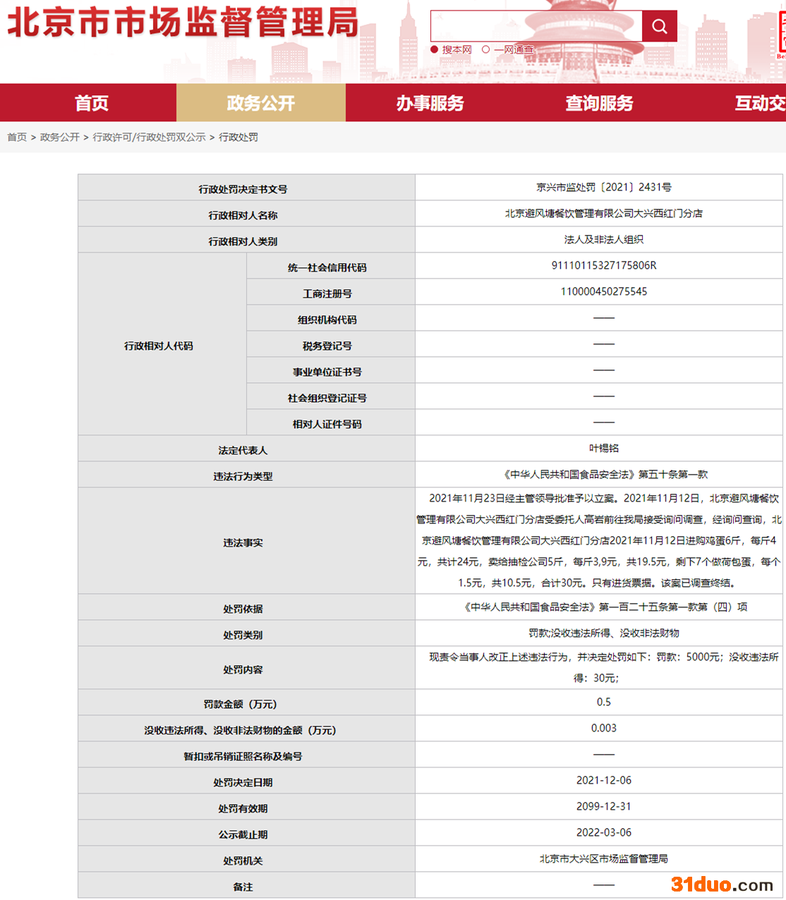 行政处罚决定书(京兴市监处罚〔2021〕2431号)显示,该分店具体违法事实为,2021年11月12日,北京避风塘餐饮管理有限公司大兴西红门分店受委托人高岩前往北京市大兴区市场监督管理局接受询问调查,经询问查询,北京避风塘餐饮管理有限公司大兴西红门分店2021年11月12日进购鸡蛋6斤,每斤4元,共计24元,卖给抽检公司5斤,每斤3,9元,共19.5元,剩下7个做荷包蛋,每个1.5元,共10.5元,合计30元。只有进货票据。该案已调查终结。