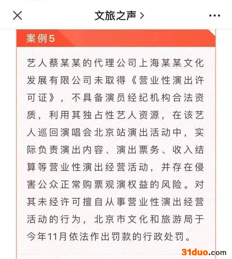 12月7日,据文旅之声公众号报道,艺人蔡某某的代理公司上海某某文化发展有限公司未取得《营业性演出许可证》,不具备演员经纪机构合法资质,利用其独占性艺人资源,在该艺人巡回演唱会北京站演出活动中,实际负责演出内容、演出票务、收入结算等营业性演出经营活动,对此,北京市文化和旅游局于今年11月对该公司依法作出罚款的行政处罚。