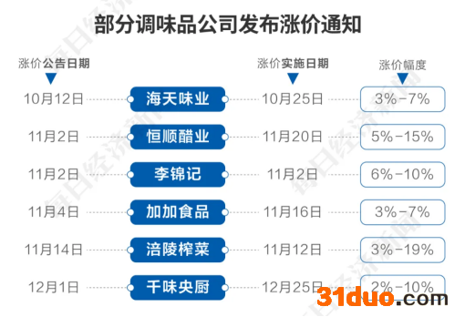 10月12日,海天味业率先提价,主要产品价格上调3%-7%不等,李锦记11月2日宣布部分产品上调6%-10%,加加食品宣布部分产品上调3%-7%,恒顺醋业自11月20日起对部分产品进行价格调整,调整幅度5%-15%不等。