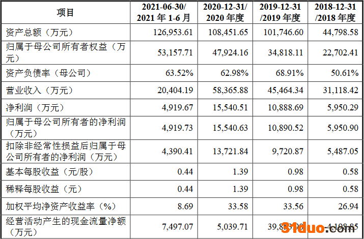 2018年、2019年和2020年,泽宇智能实现营业收入分别为3.11亿元、4.55亿元和5.84亿元,实现归属于母公司所有者的净利润分别为5950.90万元、1.09亿元和1.55亿元,实现扣除非经常性损益后归属于母公司所有者的净利润分别为5487.05万元、9720.87万元和1.37亿元;经营活动产生的现金流量净额分别为-4198.85万元、3.99亿元和5039.71万元。