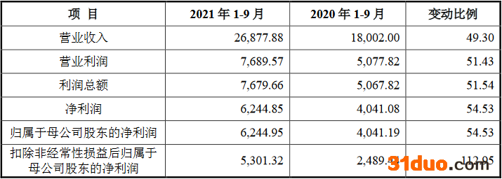 2021年1-9月,泽宇智能实现营业收入2.69亿元,较2020年同期增加8875.87万元,增幅49.30%;净利润6244.85万元,较上年同期增长54.53%;扣除非经常性损益后归属于母公司股东的净利润5301.32万元,较上年同期增长112.95%;经营活动产生的现金流量净额为1.54亿元,上年同期为-1215.78万元。