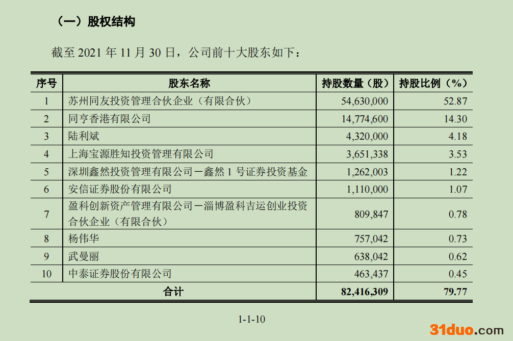 在昨日晚间同享科技发布的公告中,也披露了截至今年11月30日公司的前10大股东。在这10大股东里有两家券商——安信证券和中泰证券,分别持股111万股、46.34万股。