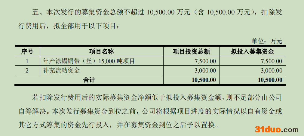 12月7日傍晚,北交所上市公司同享科技发布公告称,拟以竞价方式向特定对象发行股份不超过600万股(占目前总股本的5.81%),募集资金总额不超过1.05亿元,其中拟用于“年产涂锡铜带(丝)15,000 吨项目 ”的资金为7500万元,其余3000万元用于补充流动资金。同享科技为去年7月首批精选层挂牌公司之一。
