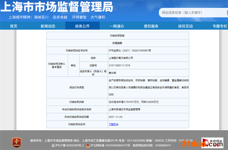 中国网财经12月8日讯(记者钟文鑫)据上海市市场监督管理局网站消息,近日,上海昱亦餐饮有限公司(胖哥俩肉蟹煲上海五角场店)因经