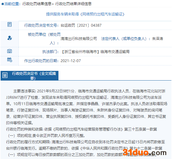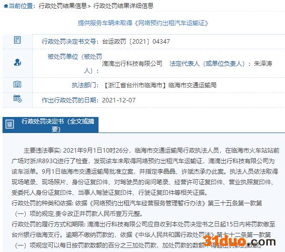 行政处罚决定书(台运政罚〔2021〕04347)显示,主要违法事实为,2021年9月1日10时26分,临海市交通运输局行政执法人员,在临海市火车站站前广场对浙JR893Q进行了检查,发现该车未取得网络预约出租汽车运输证,滴滴出行科技有限公司为该车派单。9月1日临海市交通运输局批准立案。依据《网络预约出租汽车经营服务管理暂行办法》第三十五条第一款第(一)项的规定,临海市交通运输局责令滴滴出行科技有限公司改正并罚款人民币壹万元整(1万元)。