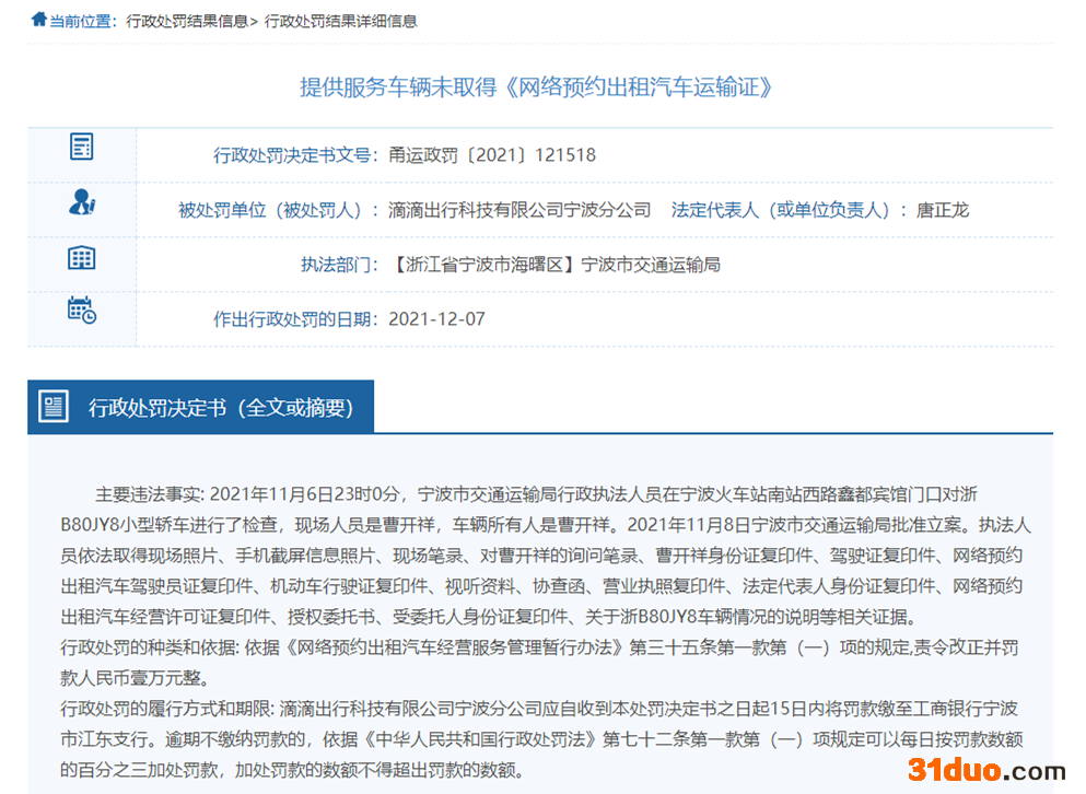 行政处罚决定书(甬运政罚〔2021〕121519)显示,主要违法事实为,2021年11月7日21时30分,宁波市交通运输局行政执法人员在宁波火车站北广场网约车上客点F区对浙B83HR6小型轿车进行了检查,现场人员是王东风,车辆所有人是王东风。2021年11月8日宁波市交通运输局批准立案。依据《网络预约出租汽车经营服务管理暂行办法》第三十五条第一款第(一)项的规定,宁波市交通运输局责令滴滴出行科技有限公司宁波分公司改正并罚款人民币壹万元整(1万元)。