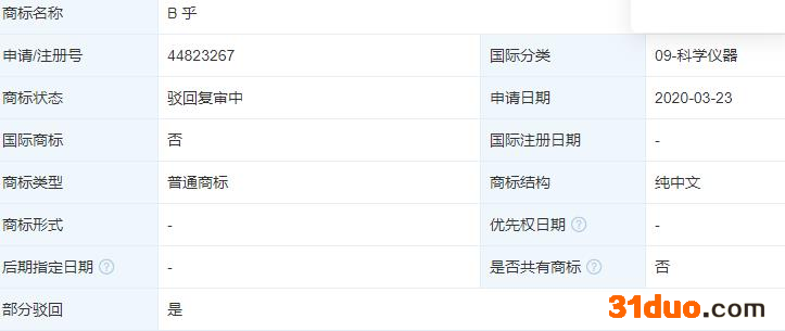 中国经济网北京12月8日讯 中国经济网记者在天眼查看到,近日,知乎关联公司智者四海(北京)技术有限公司申请注册的“B乎”商标状态变更为“驳回复审”,商标国际分类为科学仪器,申请日期为2020年3月23日。