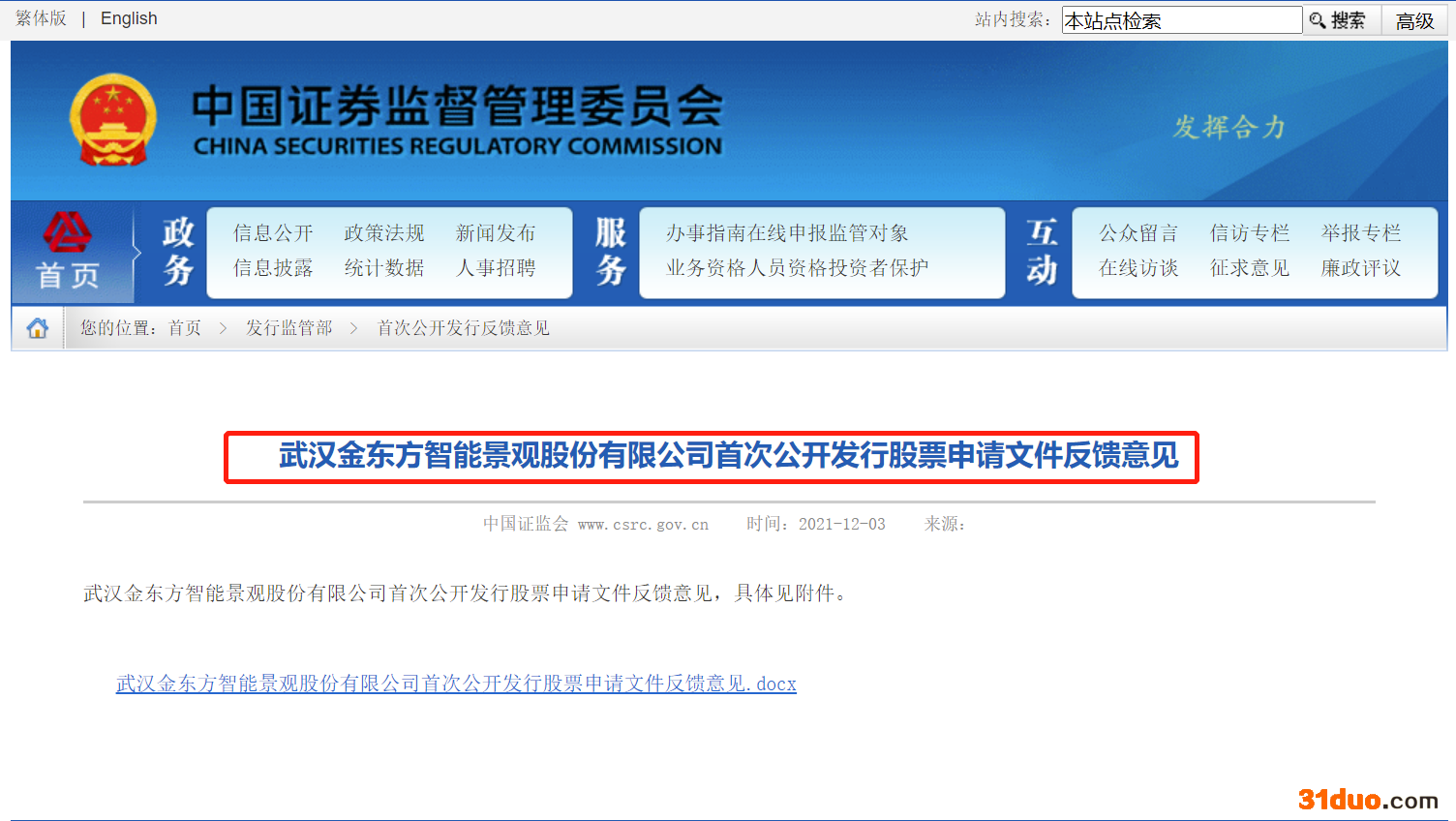 中华网财经12月8日讯,近日,证监会官网披露了武汉金东方智能景观股份有限公司(以下简称“金东方”)的首发反馈意见。此前,2021年6月22日,金东方披露招股说明书(申报稿),拟在深交所主板上市。