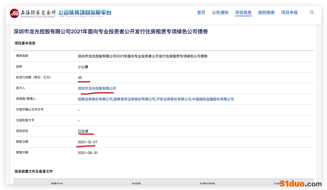 据悉,该期债券全称为深圳市龙光控股有限公司2021年面向专业投资者公开发行住房租赁专项绿色公司债券,品种小公募,拟发行金额35亿元,发行人深圳市龙光控股有限公司,承销商/管理人为招商证券股份有限公司,国泰君安证券股份有限公司,平安证券股份有限公司,中国国际金融股份有限公司。