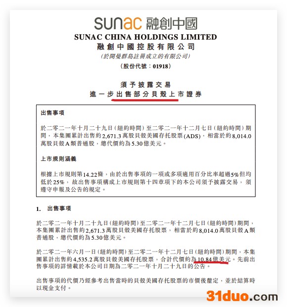 资料显示,2021年6月1日(纽约时间)至2021年12月7日(纽约时间)期间,融创中国累计出售约4535.2万股贝壳美国存托股票,合计代价约为10.84亿美元。