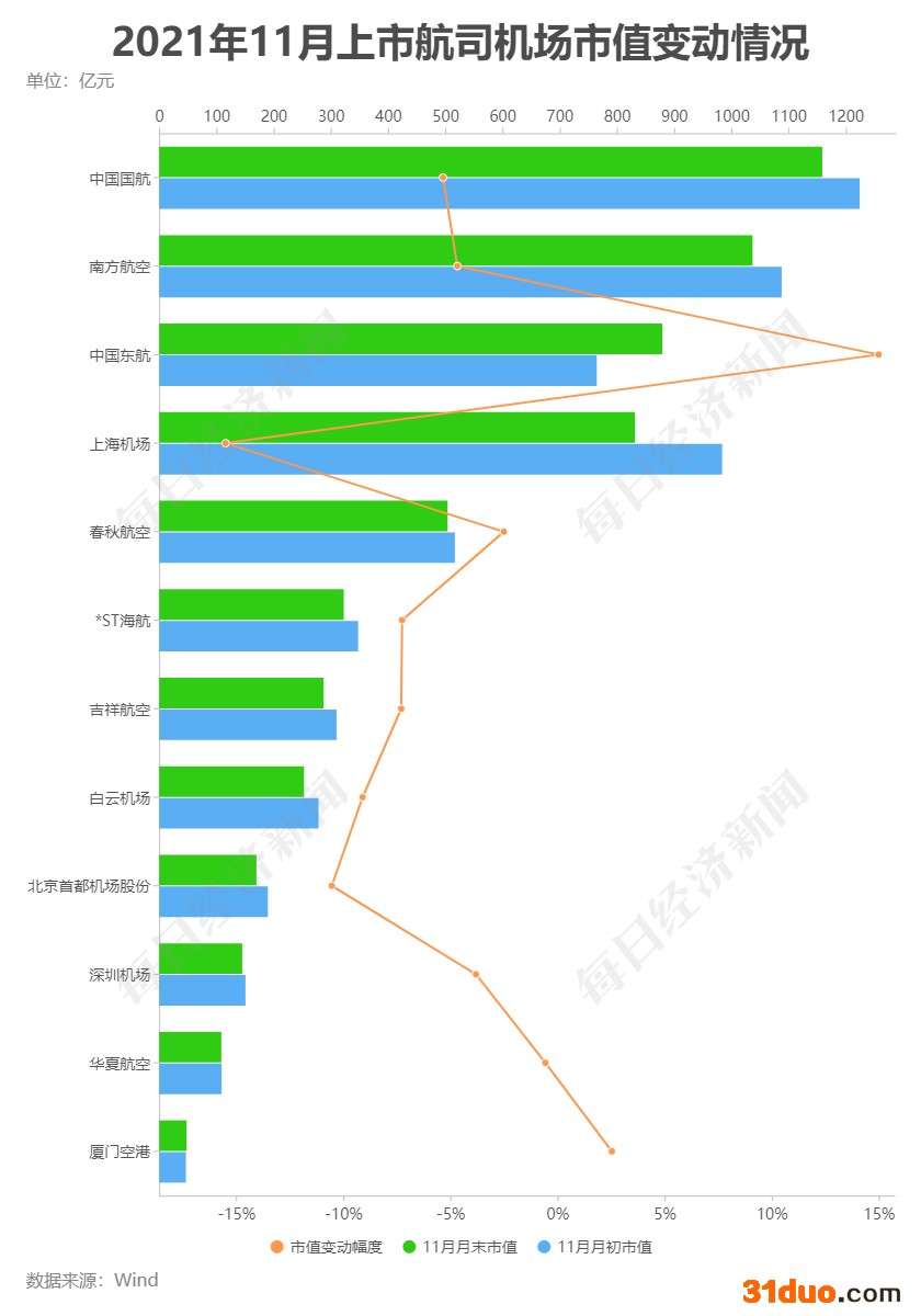 由于新发行了24.95亿股,中国东航(600115,SH)市值逆市上涨14.99%。另一方面,此前上海机场已经维持了近三个月的股价上行趋势,但在11月遭遇“滑铁卢”,市值蒸发约152.42亿元,相较于月初下降了15.49%,成为11月市值跌幅最大的航空股。