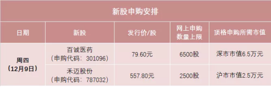 禾迈股份将于周四(12月9日)进行新股申购,顶格申购仅需沪市市值2.5万元,但中一签需缴款27.89万元。同日申购的还有创业板新股百诚医药,其发行价为79.6元/股。