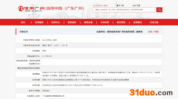 中国网财经12月9日讯 今日,信用广州发布一则关于广东康慈医疗管理有限公司的行政处罚信息(穗税二稽罚〔2021〕341 号)。