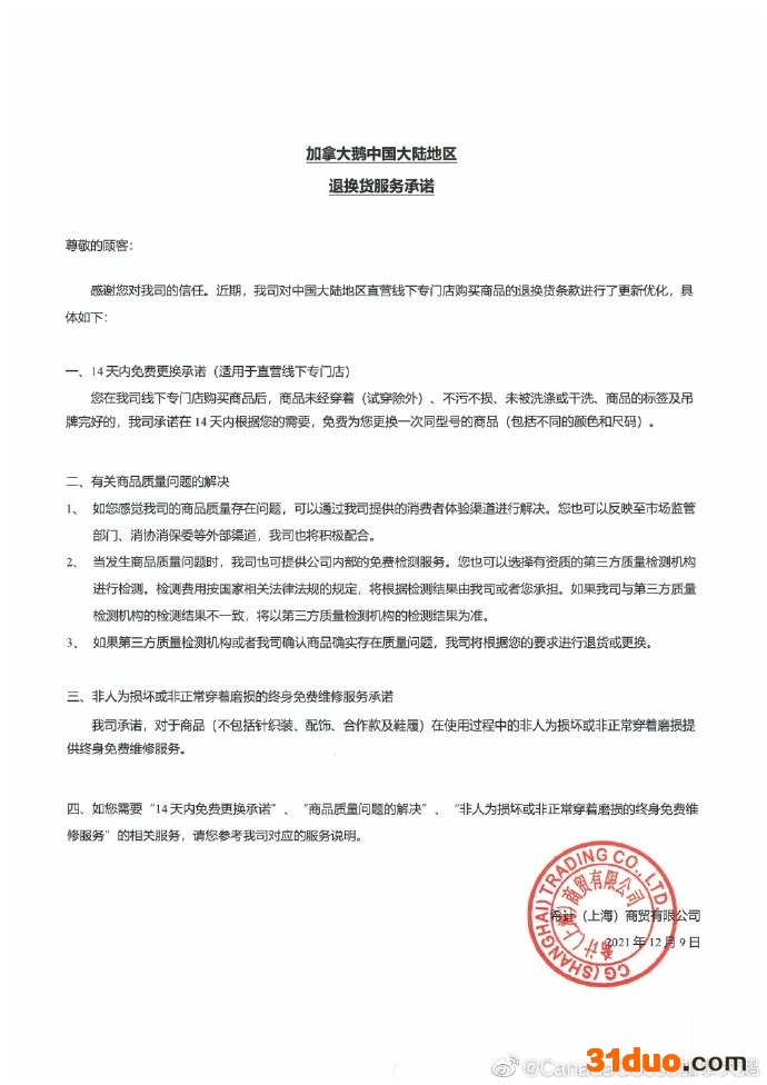中新经纬12月9日电 9日晚,加拿大鹅官方微博再次发布声明称,在上海市消保委的指导帮助下,公司更新并优化了“加拿大鹅中国大陆地区退换货服务承诺”。此外,公司也将继续与上海市消保委合作,在中国法律法规框架下,结合行业实践,探索提升消费者满意度的更多途径。