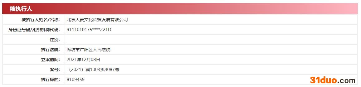 中国经济网北京12月9日讯 近日,执行信息公开网显示,北京大麦文化传媒发展有限公司新增被执行人信息,案号(2021)冀1003执4087号,执行标的810.95万元,立案日期为2021年12月8日,执行法院为廊坊市广阳区人民法院。