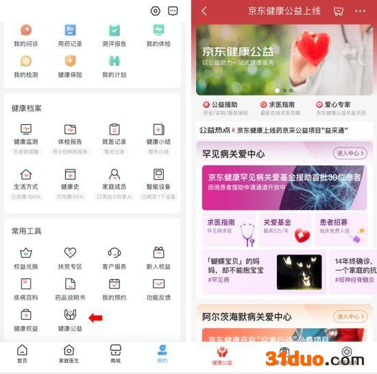 (打开京东健康APP-“我的”菜单栏,在页面下方点击“健康公益”即可进入)
