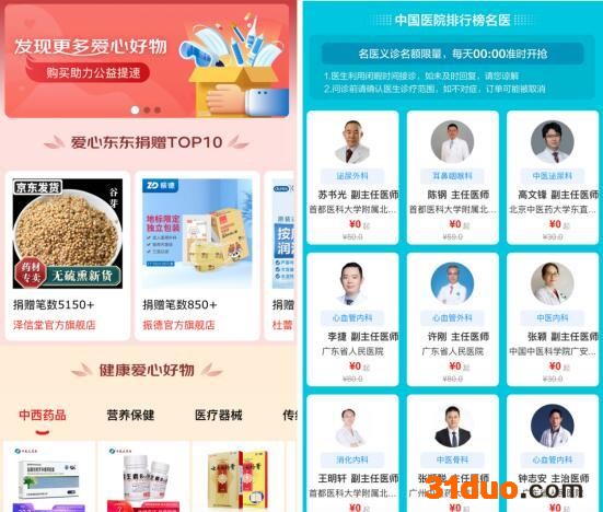 (在京东健康公益平台上,“爱心东东”和“在线义诊”的页面示意)