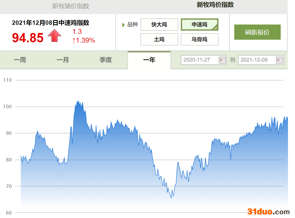 值得一提的是,今年豆粕等原料价格上涨,致使养殖成本居高不下,养殖端补栏较为谨慎,特别是散户。上述养鸡大户均对记者表示,目前来看,成本端的压力并没有减轻,未来黄羽鸡生产成本波动主要取决于大宗原材料价格走势。卓创资讯研究员冯筱程对记者表示,"对于一体化经营公司来看,养殖成本相对可控,要低于中小养殖户"。温氏股份亦表示,2021年第三季度肉鸡养殖完全成本约 6.6/斤,剔除饲料原料上涨因素提高的0.7元/斤,整体相比去年同期下降0.4元/斤。公司11月肉鸡毛鸡销售均价为14.37元/公斤。