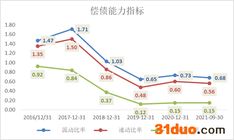一般情况下,流动比率保持在 2∶1,速动比率通常保持在 1∶1 比较正常,很显然,无论是流动比率,还是速动比率,公司偿债能力指标均低于正常水平,从侧面反映出公司的短期偿债风险较大。