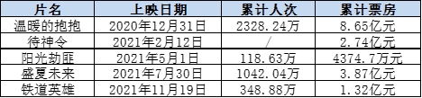 2021年,华谊兄弟出品的电影表现欠佳,缺乏像2020年《八佰》这样叫座的作品。大手笔制作铁道英雄,最终仅获得1.32亿元的票房。