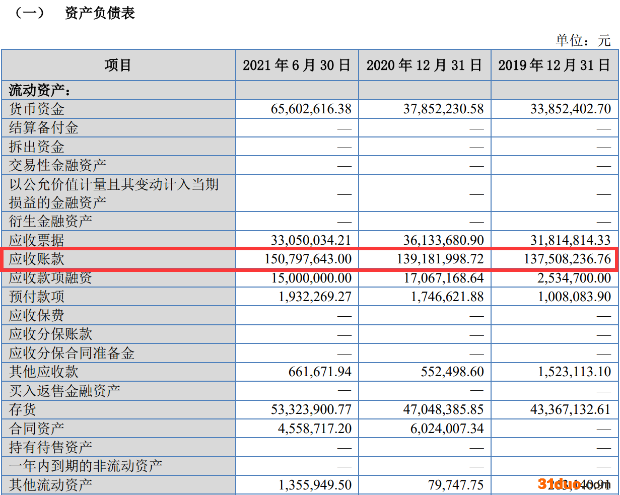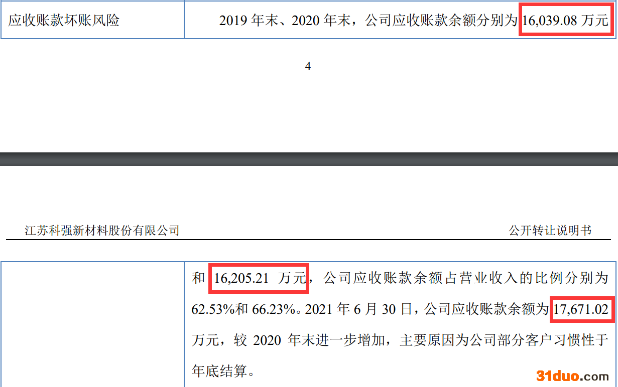 首先,在《公开转让说明书》“重大风险或事项”部分,科强股份披露,截至2019年末、2020年末、2021年上半年末,其应收账款余额分别为1.6亿元、1.62亿元和1.77亿元;而在“资产负债表”部分显示,在上述期间末,科强股份的应收账款分别为1.38亿元、1.39亿元和1.51亿元,即便再加上应收账款融资,与“重大风险或事项”部分披露的数据也不相符。