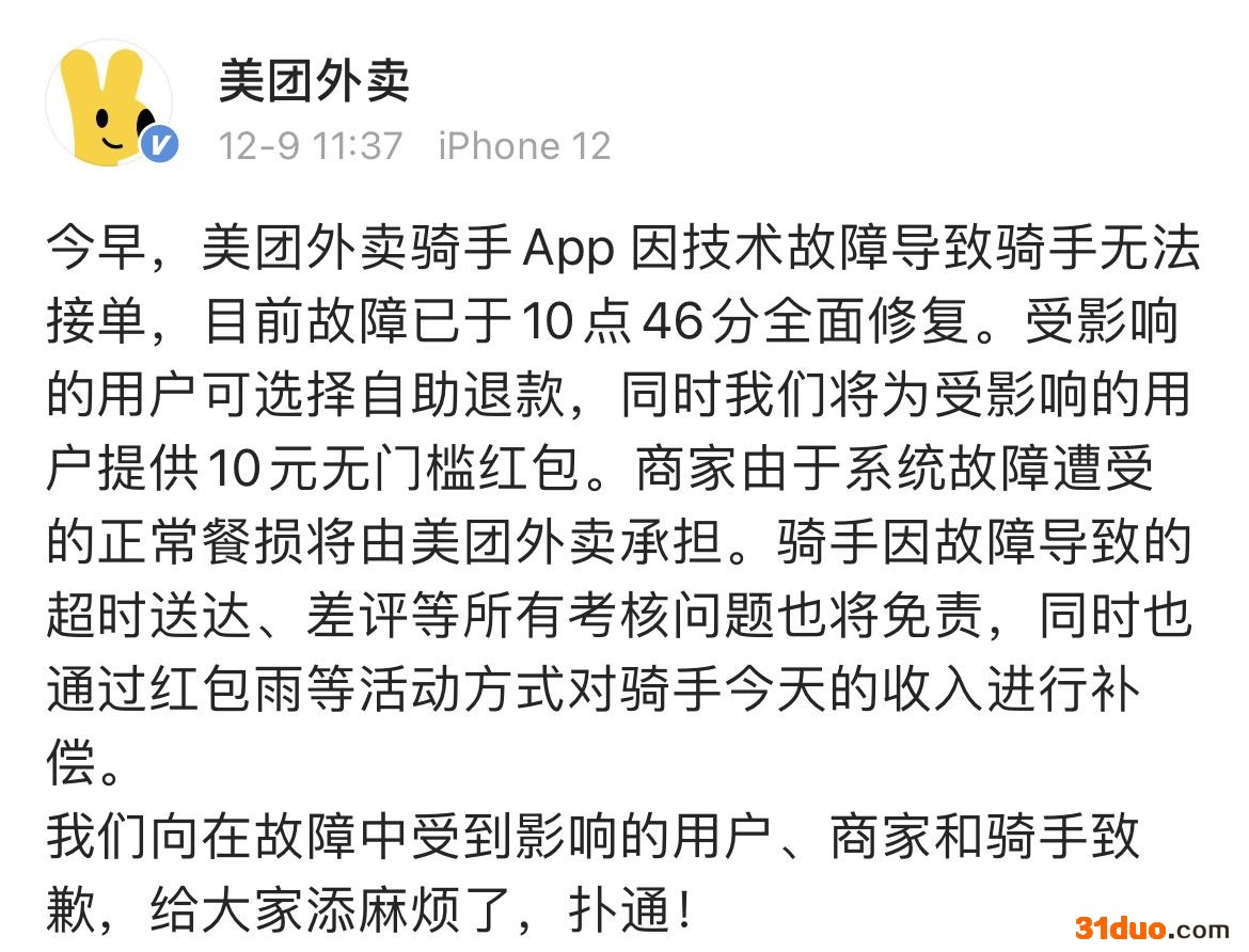 中新经纬12月9日电 12月9日早,有用户反映美团外卖出现系统故障,骑手无法接单。美团外卖通过官微回应,系统于上午已经全面修复,并对受影响的用户、商家及骑手三方的补偿方案作出安排。
