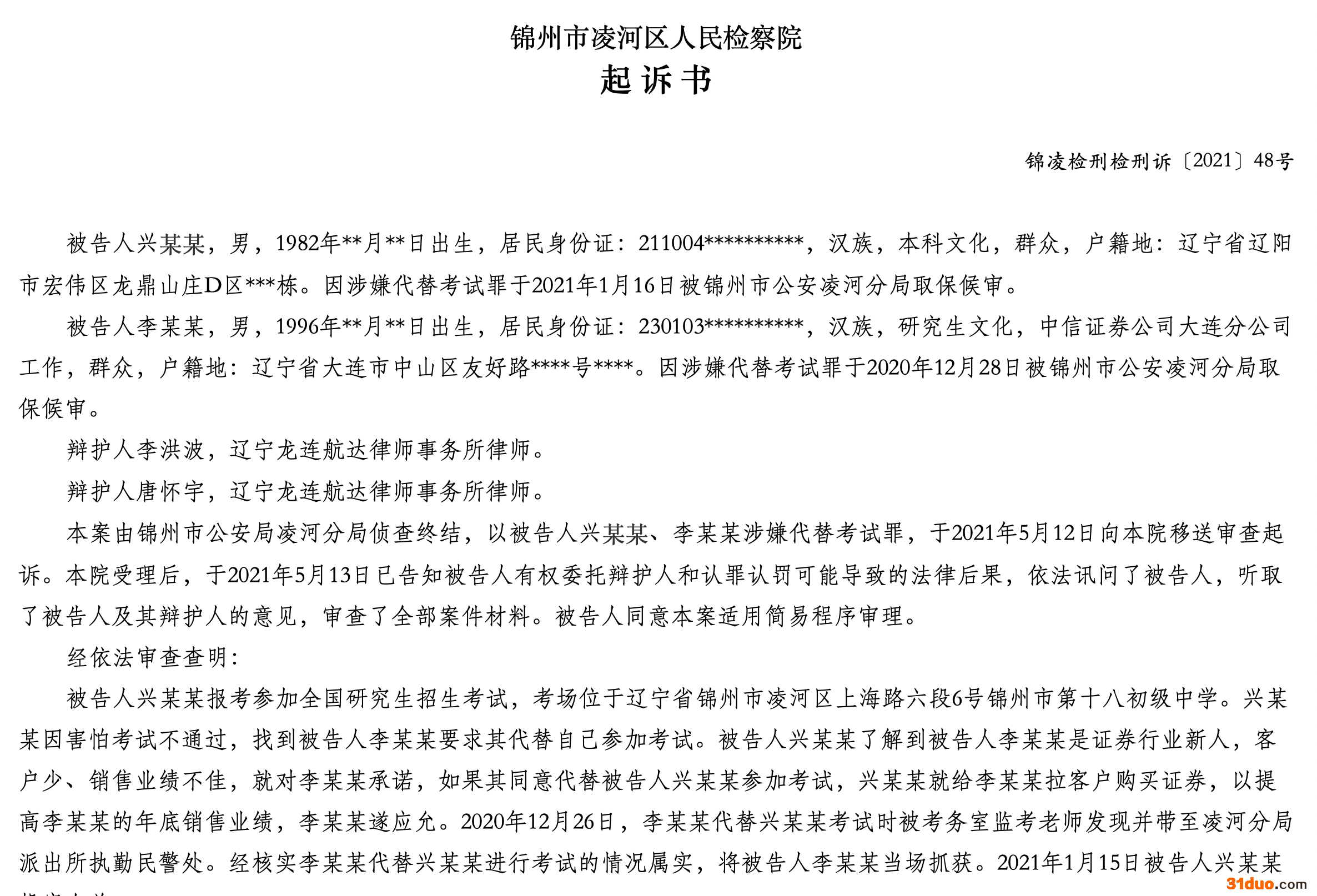 起诉书还披露了案件详情:李某某是证券行业新人,客户少、销售业绩不佳,兴某某对李某某承诺,如果其同意代替兴某某参加考试,兴某某就给李某某拉客户购买证券,以提高李某某的年底销售业绩,李某某遂应允。