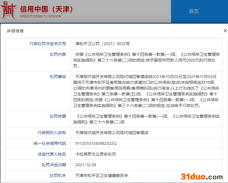 该则行政处罚信息显示,该酒店自2021年10月03日至2021年11月03日期间于天津市和平区南京路与哈尔滨道交口的公共场所(旅店)未按照规定对18层、22层的布草间内的顾客用品用具(客用棉织品)进行保洁,以上行为违反了《公共场所卫生管理条例》第三条第一款第(五)项、《公共场所卫生管理条例实施细则》第十四条的规定,依据《公共场所卫生管理条例》第十四条第一款第(一)项、《公共场所卫生管理条例实施细则》第三十六条第(二)项的规定,天津市和平区卫生健康委员会对其给予警告并罚款人民币2000元的行政处罚。