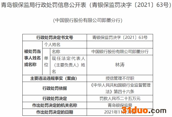 中国经济网北京12月9日讯 银保监会网站昨日公布的行政处罚信息公开表(青银保监罚决字〔2021〕63号、64号)显示,中国银行股份有限公司即墨分行存在授信管理不尽职的违法违规事实。依据《中华人民共和国银行业监督管理法》第四十六条,青岛银保监局对其罚款人民币二十五万元。