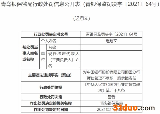 迟翔文对中国银行股份有限公司即墨分行授信管理不尽职一案承担责任,依据《中华人民共和国银行业监督管理法》第四十八条,青岛银保监局对其警告。